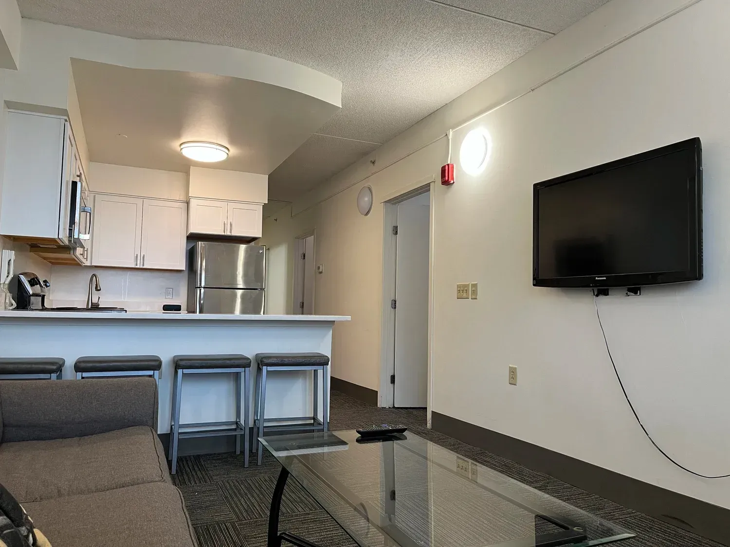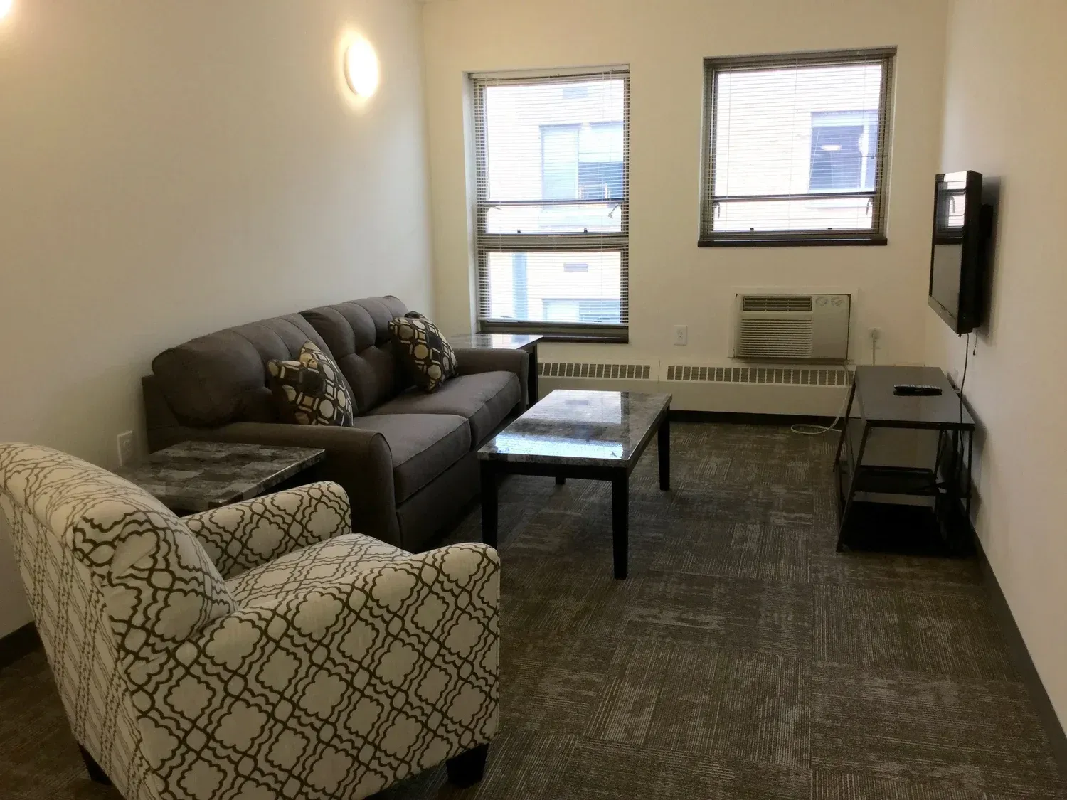 Furnished Apartments with TV’s: Double beds, desk, dresser, fully furnished living rooms and kitchen.
