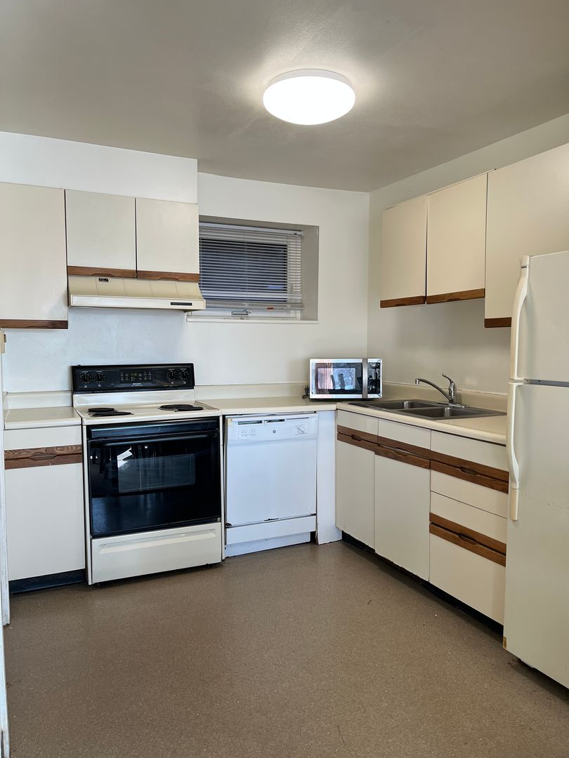- Large kitchen with essential appliances (refrigerator, microwave, dishwasher)